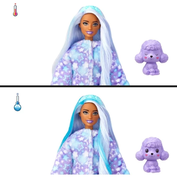 Bei den Puppen aus der Serie Barbie Cutie Reveal Cozy Cute ist schon das Auspacken ein besonderes Erlebnis. Unter dem Plüschkostüm verbirgt sich jeweils eine bewegliche Barbie-Puppe mit langen, bunten Haaren. Hinzu kommen 10 Überraschungen, wie zum Beispiel ein Stirnband, Kleidung oder ein passendes Mini-Haustier. Das Kostüm kann einfach gewendet werden und schon wird es eine kuschelige Fleece-Jacke – aus dem Kostüm-Kopf entsteht ein Bett für das Haustier. Kaltes Wasser löst einen Farbwechsel-Effekt auf den Haaren der Puppe und dem Haustier aus. Warmes Wasser macht diesen wieder rückgängig. Mit diesem Set kommt eine Puppe im süßen Plüschpudel-Kostüm mit dem Aufdruck “Star”.Art.-Nr.: 100024208